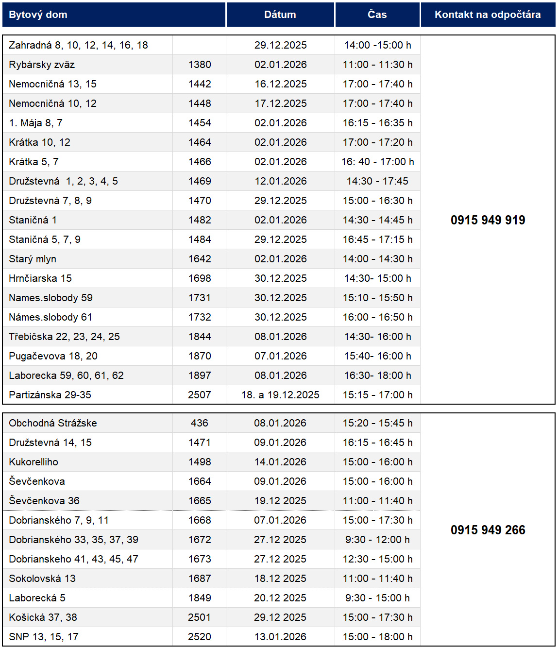 Nižššie sme spracovali orientačný rozpis konania sa odpočtov v jednotlivých objektoch, ktorých sa to týka. V prípade otázok nás neváhajte kontaktovať emailom alebo telefonicky.